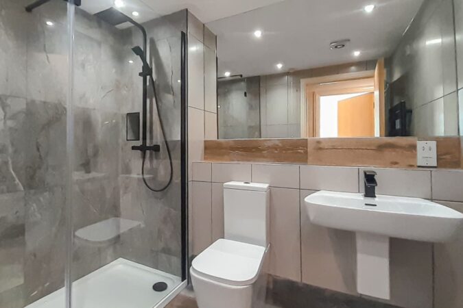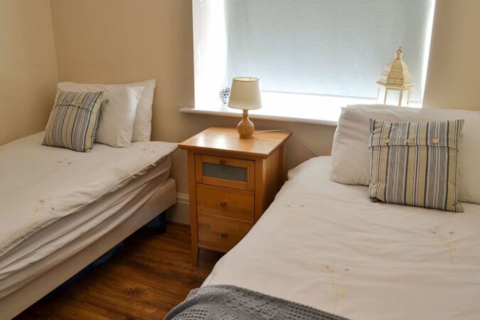 The well-equipped kitchen includes an electric oven and hob, microwave, dishwasher and washing machine, making the apartment suitable for both short breaks and longer stays. There are two comfortable bedrooms: one with a double bed and the other with twin single beds, offering flexible accommodation for couples, families or friends. A modern shower room with a cubicle shower and WC completes the layout.