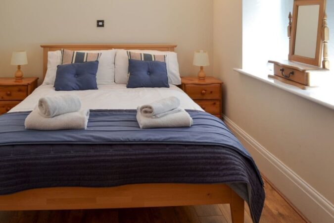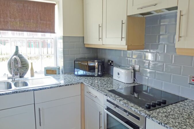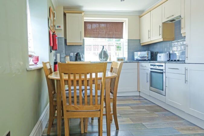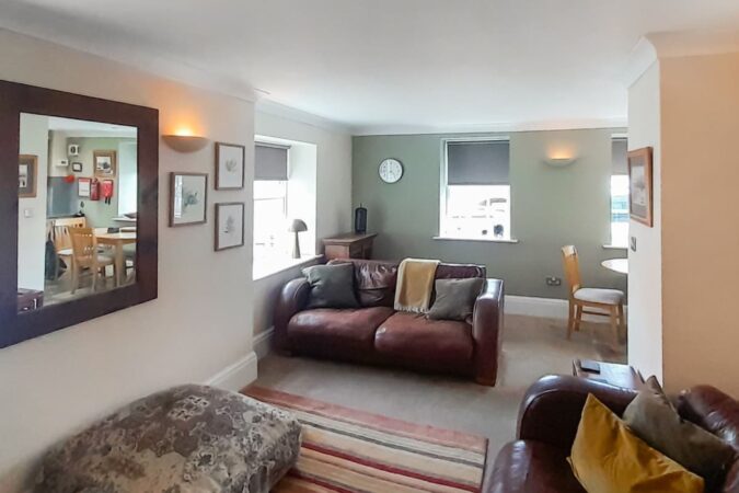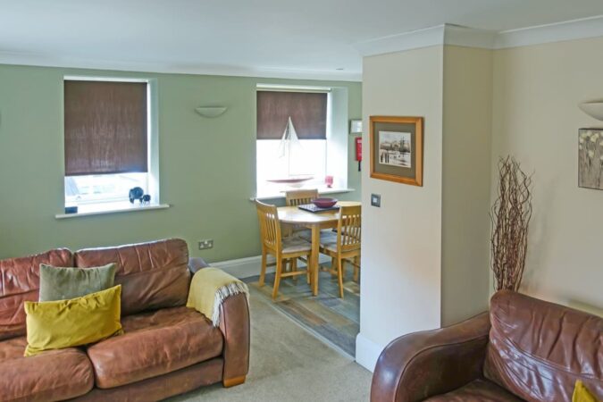 The apartment offers contemporary accommodation with thoughtful upgrades throughout, including refurbished Georgian sash windows and tasteful décor. A bright, open-plan living space enjoys lovely views over the river, creating a welcoming place to unwind after a day by the coast. The living area is comfortably furnished and equipped with a 32” Freeview TV, DVD player, CD player and iPod dock. A dining area sits alongside, providing a sociable space for shared meals.